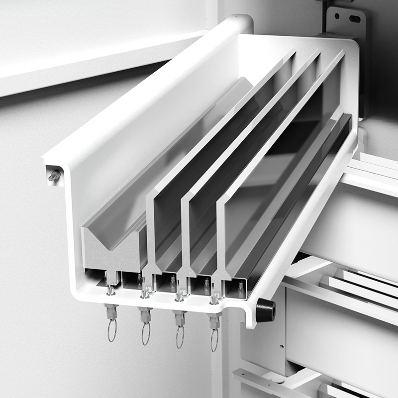 The die storage system organizes a wide range of molds, facilitating easy access for operators. This versatility allows for quick changes between different bending applications, improving overall productivity and responsiveness.